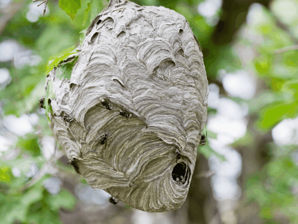 Un nid de frelons ressemble souvent à une boule ou un ovale avec une texture “papier/carton”. Sa taille peut aller de celle d’une orange à un ballon, voire plus en pleine saison.